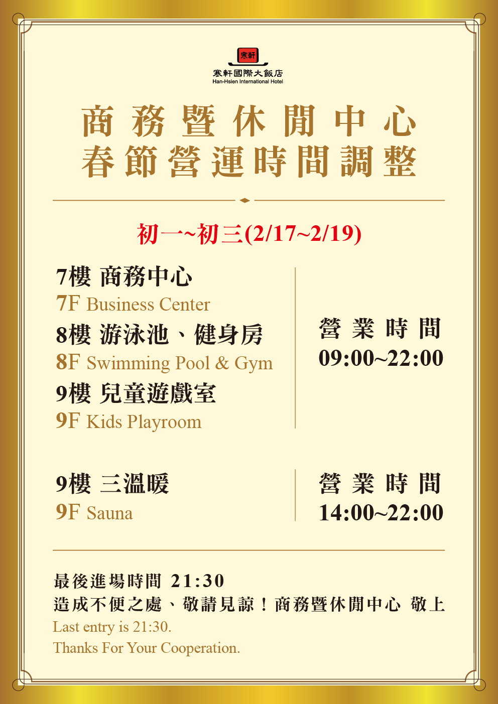 商務休閒中心春節營運時間調整